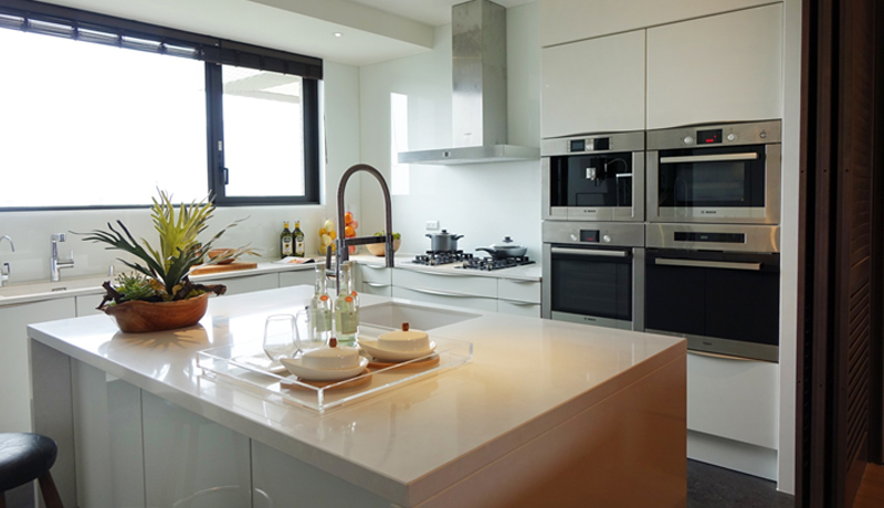 現代簡約風格純白的都會型半開放式廚房,呈現完美料理動線,為大坪數豪宅增添奢華的視覺饗宴