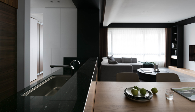 利用框景與景深的概念,透過質樸的柚木集層材作為客廳及廚房主牆的基底,材質的融合使得主要立面自然沿伸。
