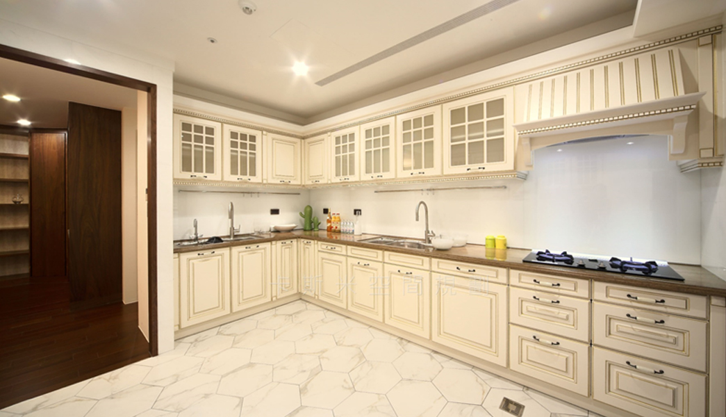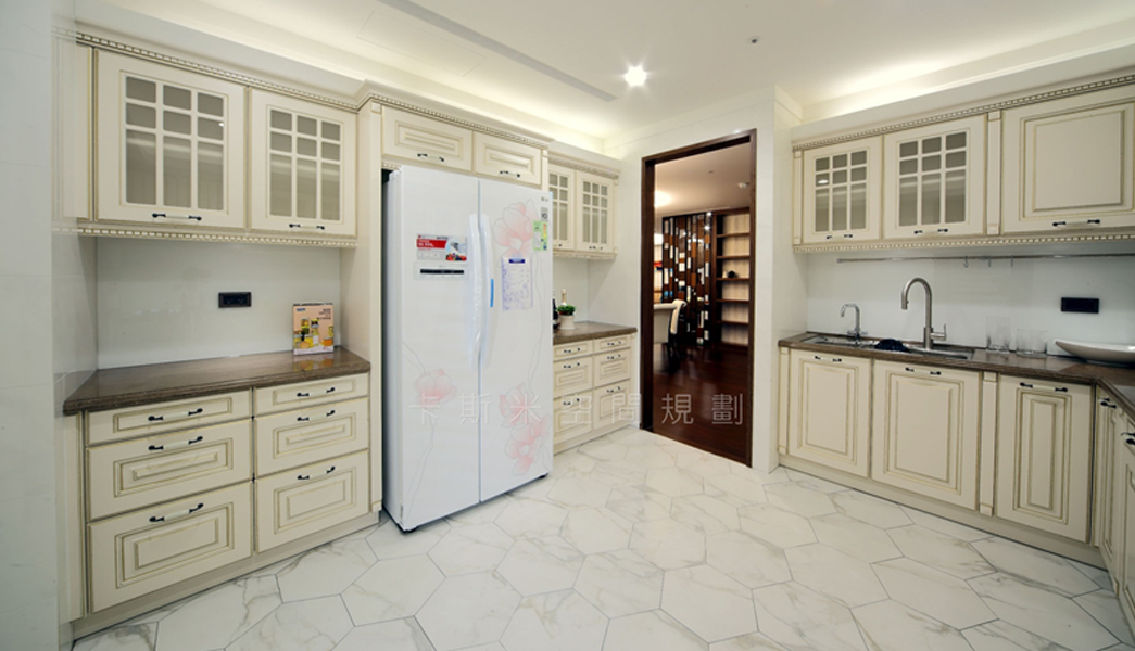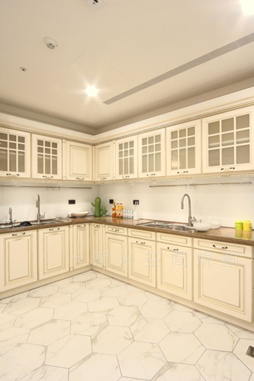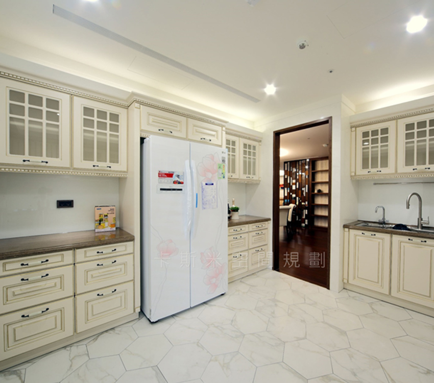 歐式古典風格,選用störmer Moskou奶油色的門板,在板材上直接壓製出復古邊框加上霧面烤漆增添了低調奢華感。