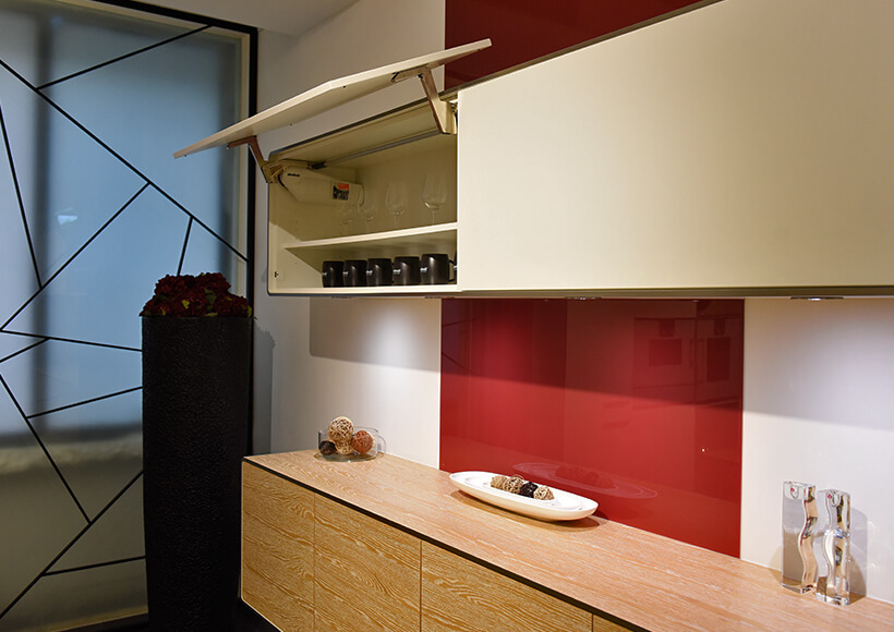 底櫃採用漂浮及tip tec開啟的設計,整體更極簡靈活,電動液壓升降的中島,隨著家庭成員不同的使用習慣或場合可調整高度。